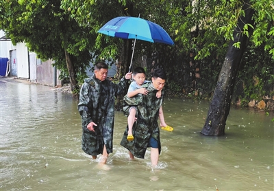 當(dāng)天10時(shí)50分,三鄉(xiāng)鎮(zhèn)泉眼村內(nèi)多處路段發(fā)生水浸,退役軍人梁卓興和泉眼村消防站隊(duì)員巡查到泉源路16號(hào)路段時(shí),發(fā)現(xiàn)一名小朋友因水浸無法回家,于是他們上前詢問孩子父母的聯(lián)系方式及家庭地址,隨后背起小朋友,把他安全送回家。