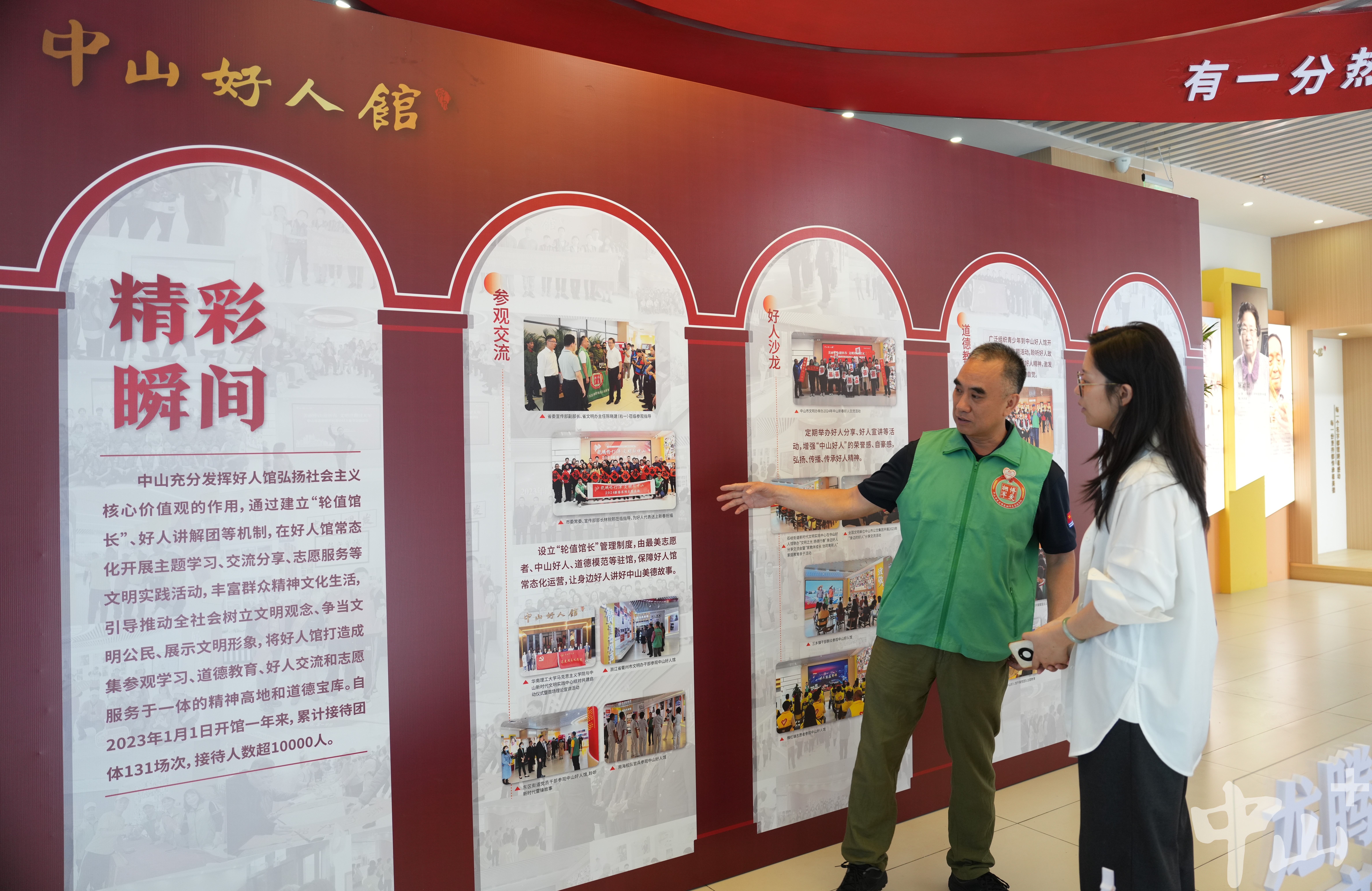 作為一名退伍軍人,李克有很多曾一起在戰(zhàn)場上出生入死的戰(zhàn)友,其中不乏已經(jīng)為國捐軀的烈士。自2007年起,他便自發(fā)組織尋找犧牲的中山籍戰(zhàn)友,先后6次帶隊前往廣西邊境的多個烈士陵園,成功尋到29名犧牲戰(zhàn)友信息,并將相關(guān)信息報送給中山市退役軍人事務(wù)局。 “我有一位戰(zhàn)友,寧愿把生的希望留給其他人,19歲不到就犧牲在戰(zhàn)場上。他們已經(jīng)離我們而去,更重要的是我們能為他們做些什么。所以逢年過節(jié)我都會看望他們的家人,把歡樂也帶給老人家。”李克說。 2016年,得知戰(zhàn)友的女兒患先天性心臟病,須進行心肺聯(lián)合移植手術(shù),李克立即帶頭捐款,并聯(lián)系政府相關(guān)部門和電視臺,通過媒體報道讓更多愛心人士關(guān)注到了這位困難老兵。在他的多方奔走下,社會各界紛紛伸出援助之手,募集醫(yī)藥費40余萬元,助戰(zhàn)友的女兒順利完成了手術(shù)。 牽頭成立志愿服務(wù)隊 延續(xù)志愿精神 作為一名有著30多年志愿服務(wù)經(jīng)歷的資深志愿者,李克的生活已經(jīng)與志愿分不開。他的身上始終有一抹綠色:在軍營,是守衛(wèi)國門的綠軍裝;在社區(qū),是服務(wù)群眾的綠馬甲。在人民群眾需要的地方,李克每次都沖在最前線。 “2020年疫情暴發(fā)時,很多人都響應(yīng)號召待在家里,我覺得作為一個打過仗的老兵,我總得站出來做點事?!睕]有過多考慮,李克第一時間加入到了志愿者隊伍中,并在社區(qū)堅守了整整60天。當(dāng)時防護物資匱乏,李克還自掏腰包托人在廣州購買了6萬元左右的防護物資,全部捐贈給了在一線抗疫的工作人員。 近年來,李克還積極捐資助學(xué)、支援災(zāi)區(qū)、扶危濟困,連續(xù)6年資助6名困難學(xué)生,為汕尾市陸河中學(xué)捐贈10套多媒體電腦設(shè)備,堅持參與無償獻血直到60歲。 2018年起,李克擔(dān)任文明城市巡查監(jiān)督員,奔走在街道各個路口、每條小巷,整理亂停亂放的共享單車,清理“牛皮癬”小廣告,保障街頭巷尾干凈衛(wèi)生。同一年,為更有組織地開展志愿活動,李克牽頭成立了一支以退役軍人為主導(dǎo)的東區(qū)博愛擁軍志愿服務(wù)隊,把戰(zhàn)友們凝聚在一起,共同為社會作貢獻。如今,這支志愿服務(wù)隊已從最初的8名成員,逐漸壯大至400多人,成為服務(wù)社會的一支生力軍。 講好好人故事,傳承紅色文化 4月19日上午,記者在“中山好人館”見到了正在擔(dān)任“輪值館長”的李克。從去年1月開始,他每個月都參與輪值,先后為140多場活動、1萬多名市民群眾義務(wù)講解博愛之城的凡人善舉、好人大愛。  正在中山好人館輪值的李克。記者 劉萬杰 攝
