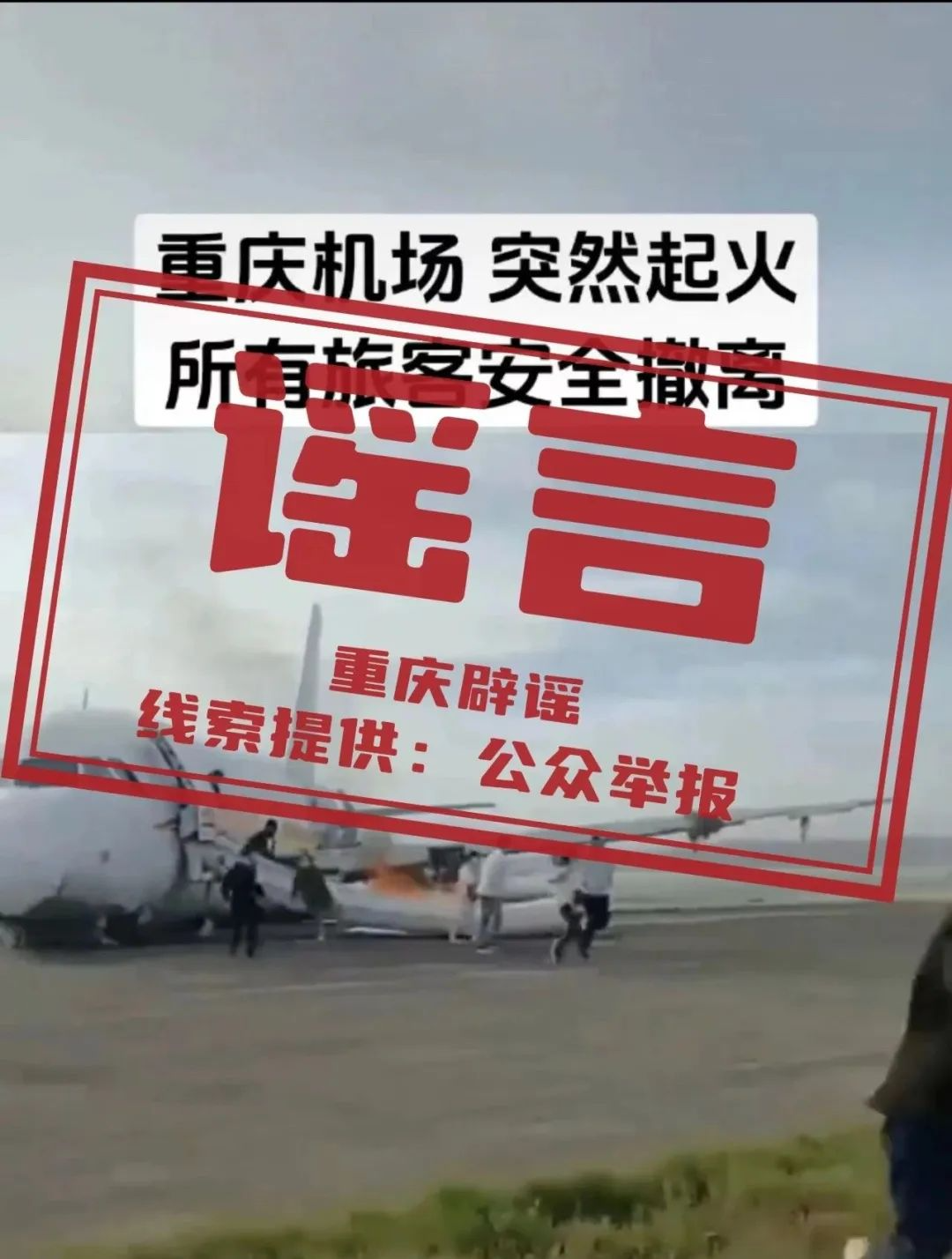 網(wǎng)傳信息為發(fā)布于某網(wǎng)站平臺的一條短視頻,視頻畫面顯示一客機(jī)停放在飛機(jī)跑道上,不少乘客正從飛機(jī)客艙中跑出,并配文稱“重慶機(jī)場突然起火,所有旅客安全撤離”。