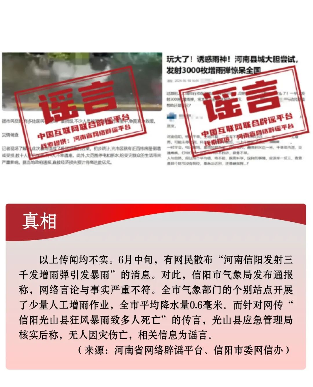 謠言7:河南信陽發(fā)射三千發(fā)增雨彈引發(fā)暴雨?信陽光山縣狂風暴雨致多人死亡?