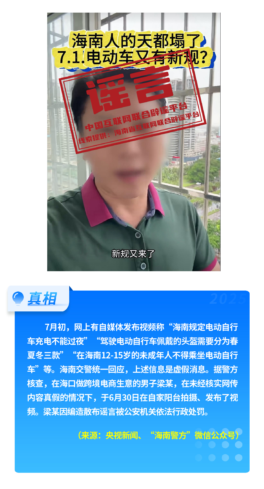 有人重新翻炒“醫(yī)保‘個人賬戶’將全部取消”舊謠,故意歪曲醫(yī)保改革真實內(nèi)涵,嚴(yán)重誤導(dǎo)公眾對醫(yī)保改革政策的理解。“有專人上門服務(wù)激活醫(yī)保碼”,披著“公共服務(wù)”的外衣,實有詐騙之嫌和安全風(fēng)險。憑空捏造“海南規(guī)定電動自行車充電不能過夜、頭盔分三季”這一“奇葩規(guī)定”,以“新規(guī)”話術(shù),擾亂交通管理秩序。