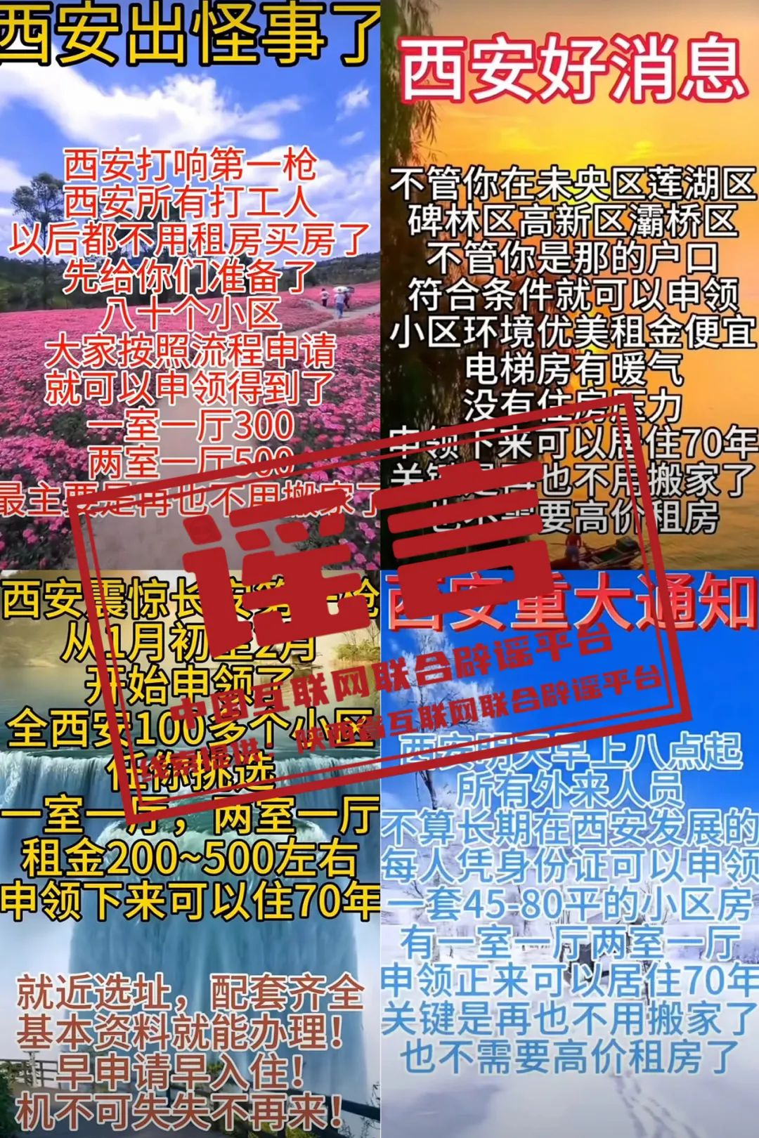 真相:近期,自媒體平臺上出現(xiàn)以“西安緊急通知”“西安出怪事了”等夸大性、煽動性話語為標題,散播“憑身份證就可申領(lǐng)”“全西安市100多個小區(qū)任你挑選”“一次申領(lǐng)可以一直居住”等模糊性、誘導(dǎo)性內(nèi)容的信息。對此,西安市保障性住房管理中心發(fā)布聲明回應(yīng)稱,以上內(nèi)容均為不實信息,是對西安市公租房政策的歪曲理解和斷章取義。該聲明還特別提醒網(wǎng)民:有關(guān)西安市保障房政策、房源等相關(guān)信息,均以西安市住建局官方媒體發(fā)布的信息為準。(來源:陜西省互聯(lián)網(wǎng)聯(lián)合辟謠平臺、“西安住建”微信公眾號)