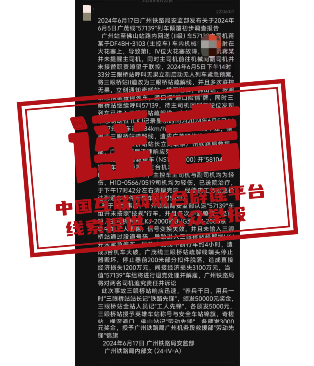 辟 謠  網(wǎng)傳“廣州鐵路局安監(jiān)部2024年6月5日廣茂線57139列車傾覆初步調(diào)查報告”為虛假信息