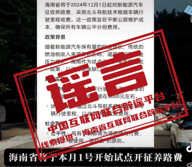 謠 言 海南12月1日起對新能源汽車征收養(yǎng)路費?